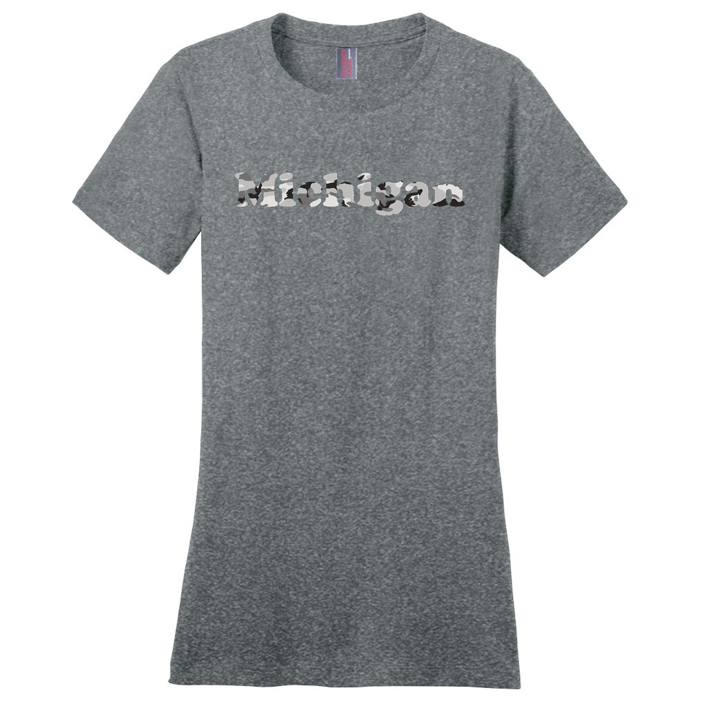Winter sports is a way of life for Michiganders. Our Michigan snow camo women's shirt combines the traditional camo pattern as a backdrop to large block Michigan lettering.